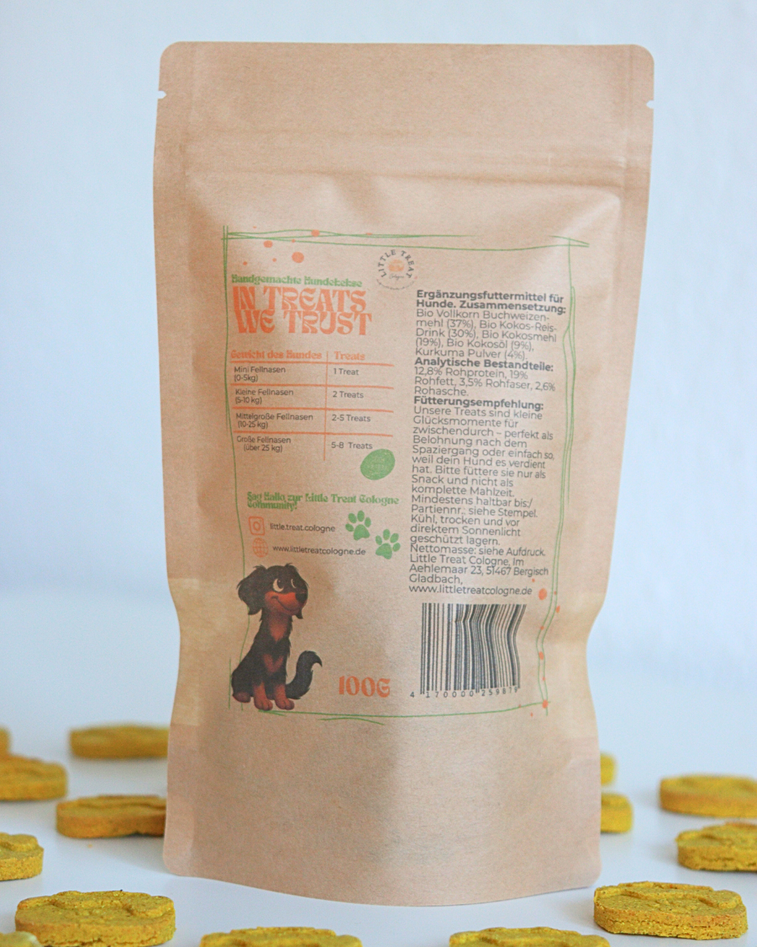 Diese super leckeren Hundetreats sind glutenfrei, laktosefrei und natürlich 100% pflanzlich. Die goldene Farbe kommt von gesundem Kurkuma, während Kokos für den extra Bissen sorgt.