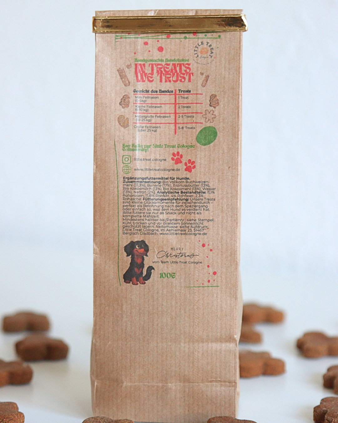 Unsere veganen, gluten- und laktosefreien Weihnachts-Hundekekse in süßer Lebkuchenmännchen-Form sind das perfekte Geschenk für jeden Vierbeiner. Mit Erdnuss, Kokos und Buchweizenmehl als hochwertigen Hauptzutaten sorgen sie für natürlichen Geschmack, festliche Stimmung und glückliche Hundebäuche.